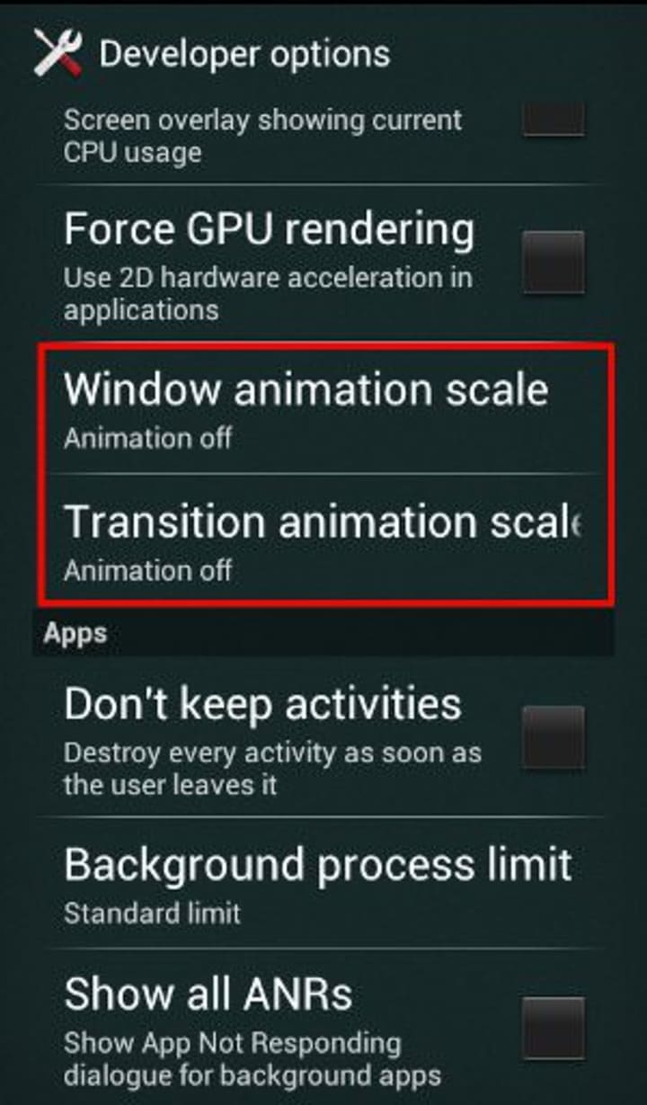 What animations? Well, if you haven’t noticed, your phone screen actually fades out and in as you switch from one task to the other. To see this in action Go to Settings > Developer Options > Window Animation Scale > Animation scale 10x. Then choose Window Animation Scale again to see the fade in effect in ‘slow-mo’.