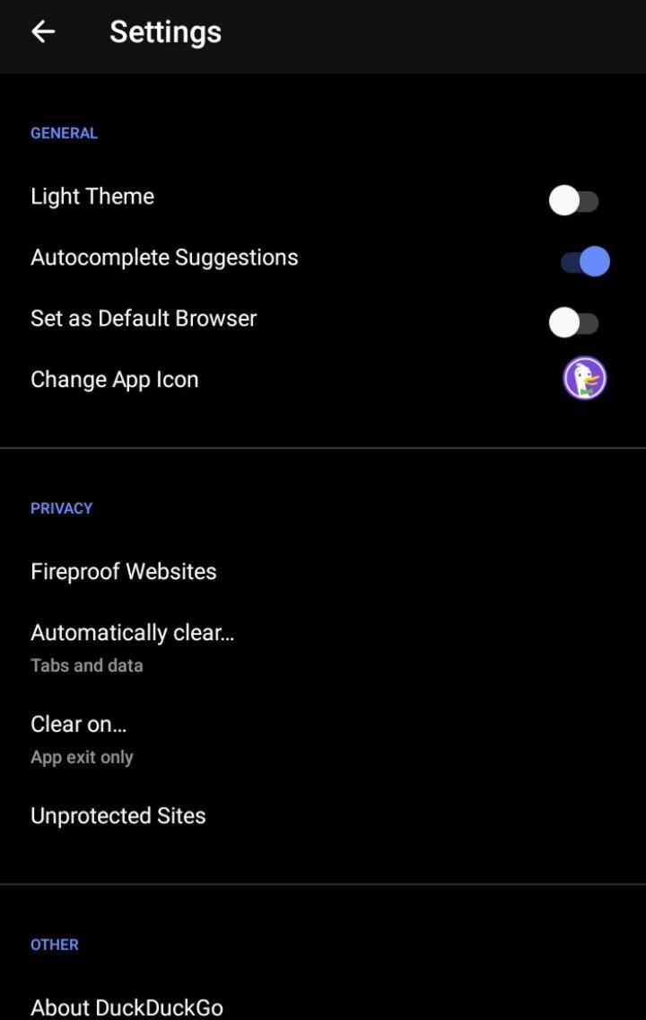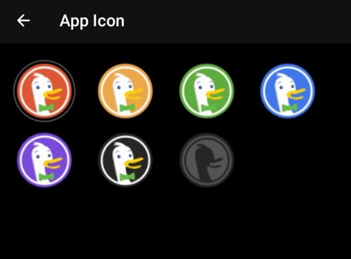 You can make some changes to your liking, like changing the app’s icon. You can switch from the default (orange) like Duck logo or choose one of the above options. I usually go for purple but this doesn’t change the browser’s performance in any way so feel free to choose any other color.