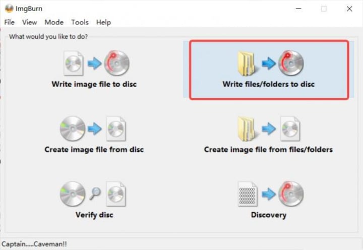 Launch ImgBurn and, in the Ez-Mode Picker, select "Write files/folders to disc".