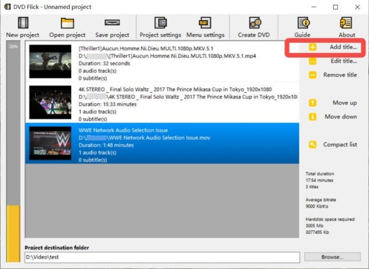 Launch DVD Flick and click "Add title" (or drag-drop) to load your videos. Select a title and hit "Edit title" to set "Chapters" (by count or time interval). In the same window you can "Add" external subtitle files and "Add" extra audio tracks if needed.