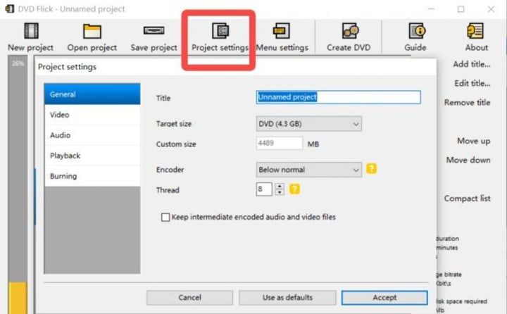 In "Project settings" → "Burning", you can tick "Burn project to disc" (pick your drive and label), or tick "Create ISO image" to build an ISO you can test and burn later. There's also an option to "Verify disc" after burning.