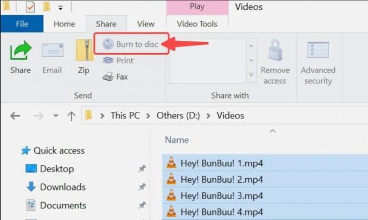 Step 2. On the top, switch to "Share", select the videos, and then select "Burn to disc."