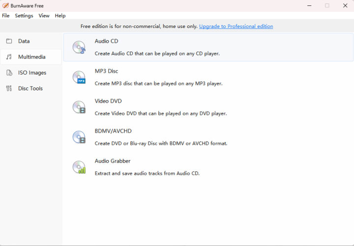BurnAware is another fully featured free DVD burn software for creating CDs, DVDs, and Blu-ray discs. It offers a friendly interface and features like disc images, spanned backups, bootable discs, and audio extraction, making DVD burning quick and easy for beginners.