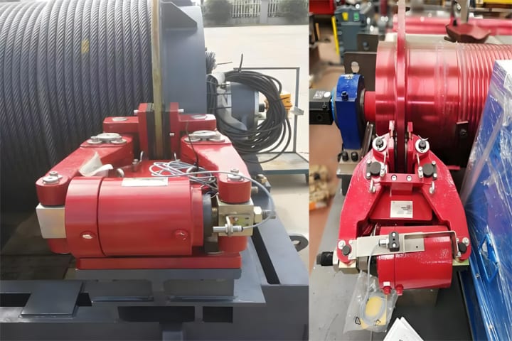 The emergency brake is a safety protection device that is controlled by a detection system composed of a high-reliability overspeed switch and an encoder. In case of failure in the hoisting mechanism transmission chain—such as overspeeding of the drum, drum asynchrony, emergency button activation, or sudden power failure—the emergency brake engages to effectively and reliably stop the drum, ensuring the crane’s safety. The emergency brake is mounted at the end of the drum. Compared with conventional brakes, it generates much greater braking torque, sufficient to independently overcome the torque generated by the full load on the hoisting mechanism's drum. The main hoisting mechanism is equipped with two sets of driving devices, and when no rigid connection exists on the output shaft or when there is only one driving device, an emergency brake must be installed on the wire rope drum.