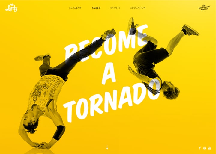 The Lordz Dance Academy offers the widest range of courses in Switzerland for hip hop, urban, and street styles. The vibrancy of Illuminating Yellow as a screen before the dancers with the white font displaying the words “Become A Tornado” shows the movement of the dancers and the words without it being distracting.