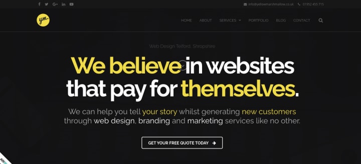 Yellow Marshmallow is a company that offers web design and marketing services. Their websites use Ultimate Gray as a shade for a photo background to highlight the Illuminating Yellow and white text for the main page is eye-catching. Paired with the scrolling animation and the spinning animation when your mouse hovers over an icon makes this website highly creative and quirky!