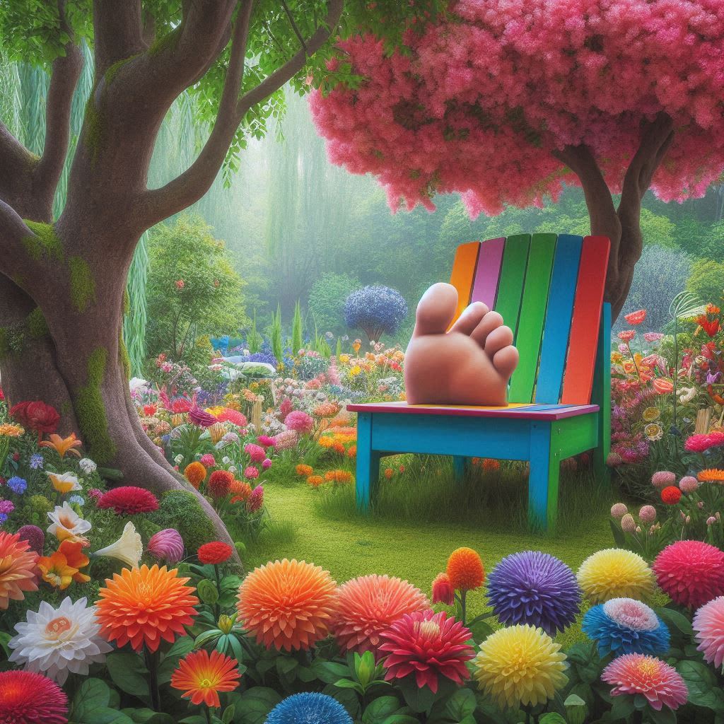 Have you ever imagined a chair with a giant foot casually resting on it, surrounded by a dreamlike garden?