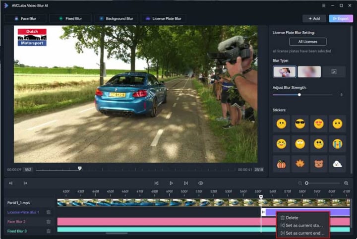 This program blurs all license plates in the video by default. What users need to change are the blur type (Mosaics, Gaussian blur, customized images, and preset stickers) and blur strength.