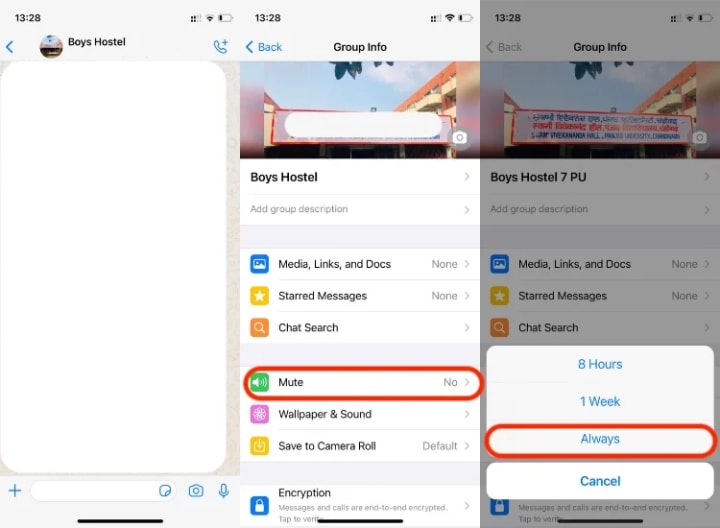 To mute a contact/group, open the chat and tap on the contact name to view profile > scroll down to ‘Mute’ > Tap on ‘Always.‘