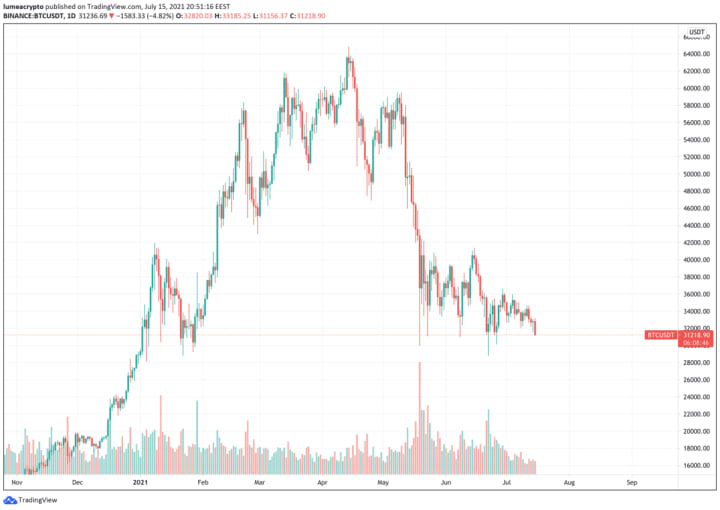 In early February, when Tesla announced that it had bought $ 1.5 billion worth of Bitcoin, BTC rose 20% that day. This event set off a rising trend that stopped in mid-April, after reaching a $ 65,000 price target.