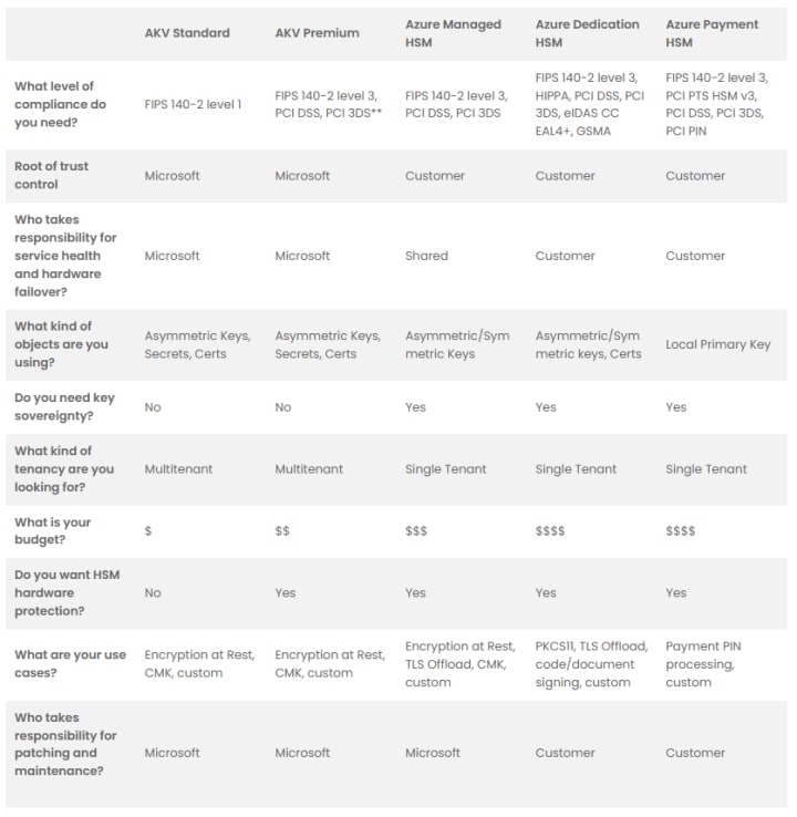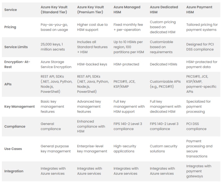 Azure Key Vault and Azure Managed HSM have the least customer responsibility, while Azure Dedicated HSM and Azure Payment HSM have the greatest. These are the different ranges of management duties.