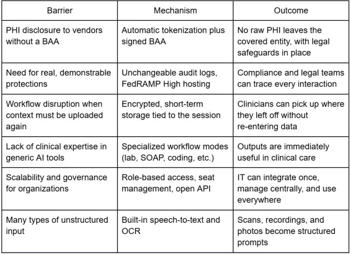 Organizations have tried two main strategies to address this dilemma, but each brings new problems. The first strategy is to run open source LLMs within the hospital’s own environment. This keeps PHI internal, but introduces new challenges, such as maintaining GPU hardware, patching security flaws, managing fresh training data, and hiring specialized engineers to tune the system at all hours. The second approach is to enforce a strict “no-AI” policy. While this eliminates certain risks on paper, it keeps clinicians stuck with manual chart review and documentation. As a result, their laptops fill with copy-and-paste tasks, web searches, and incomplete notes while patients wait.