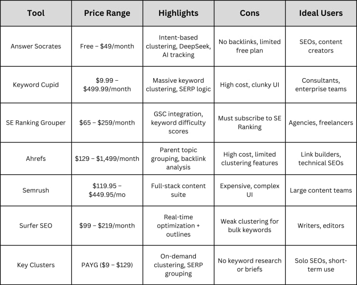 ✅ If you want fast keyword clustering, excellent value, and no bloat — Answer Socrates leads the pack.