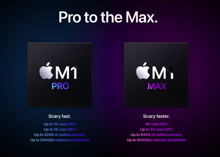 Apple's new MacBook Pro models can be configured with the M1 Pro chip or the M1 Max chip. Both chips feature a 10-core CPU with eight high-performance cores and two high-efficiency cores, though there is a lower-end 8-core model available for the entry-level 14-inch MacBook Pro. There's also a 16-core Neural Engine in both chips.