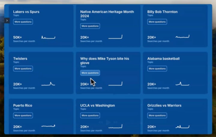 From a single topic, you can instantly generate 1,000+ keyword questions, organize them into clusters, and even discover wildcard ideas using AI. Add in tools for trending topic alerts, AI model brand detection, and stat-based content hooks—and you’ve got a full SEO growth engine.