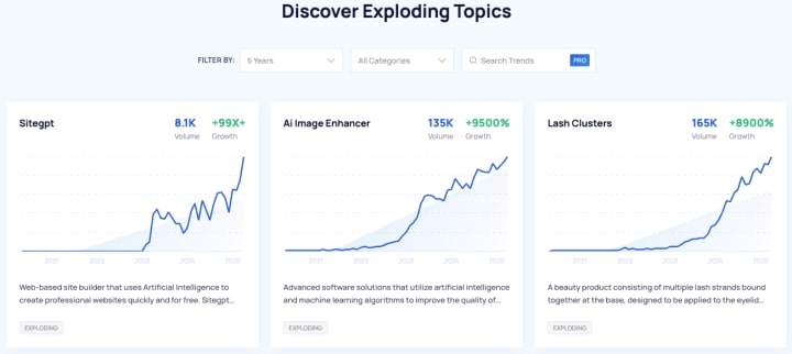 While Exploding Topics doesn’t offer SEO features directly, it’s a killer tool for discovering rising trends before they hit Google’s radar.