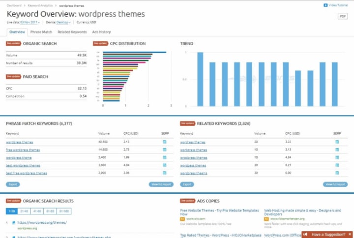 You can spy on your competitors’ Google Ads, analyze organic vs. paid keywords, and see what ad copy has been performing well over time.