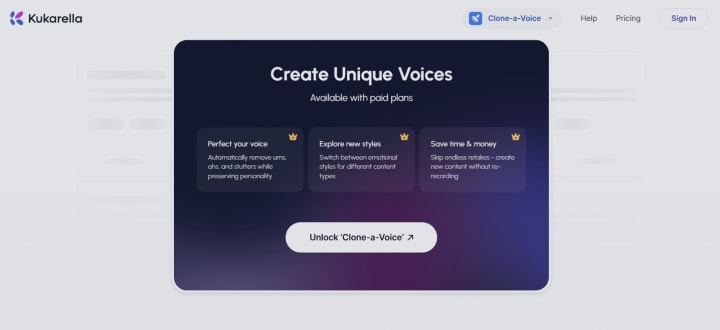 Kukarella offers voice cloning services across more than 50 languages, with options to adjust emotional expression, such as happy, sad, or professional tones. The tool includes transcription and AI writing features alongside cloning to support a broad range of content creation needs. Users create clones by uploading voice samples and can modulate emotional tone in the cloned output.