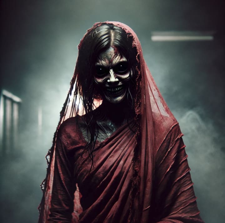 The woman in the red saree stood just a few feet away now, her face shrouded in shadows. But something was wrong. Her neck—it wasn’t right. It was twisted at an unnatural angle, as though she had been hanged or broken. Her dark, hollow eyes bored into them, and a grotesque smile slowly stretched across her face.