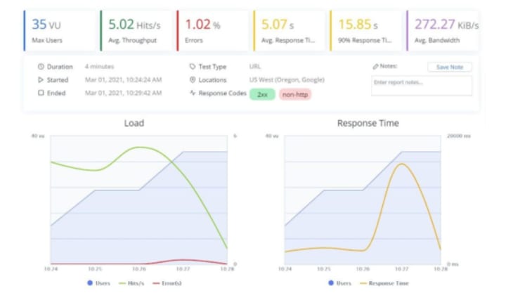We used BlazeMeter to see how the server responds to 35 visitors browsing over the same four-minute period (a somewhat difficult test for a cheap shared host).