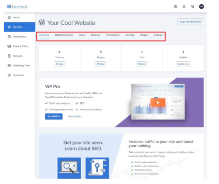 When you open a site's dashboard in Bluehost, you can manage not only its hosting settings, but also WordPress-specific settings and options, such as WordPress users, plugins, and themes.