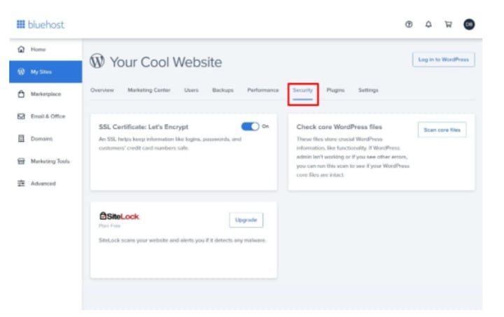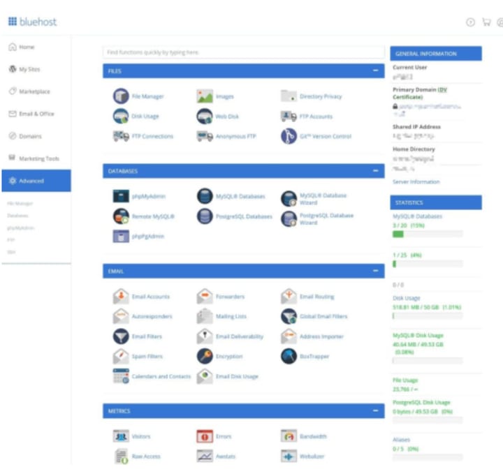 Bluehost has created its own custom hosting dashboard while still providing access to cPanel, which is useful for more advanced users who want to use the many tools available in cPanel.