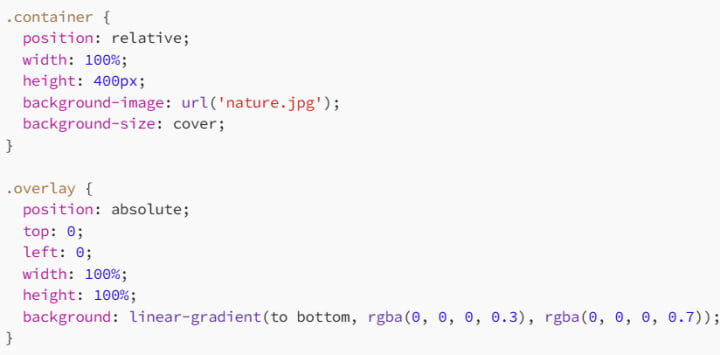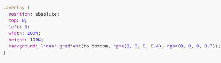 Here, we use a linear gradient to transition from a semi-transparent black (rgba(0, 0, 0, 0.4)) to a darker black (rgba(0, 0, 0, 0.7)), creating a smooth overlay effect that fades as it moves down the page.