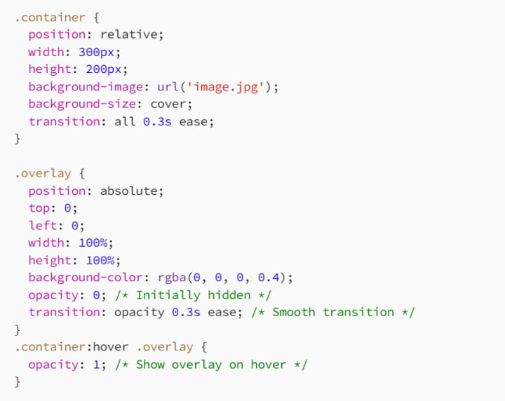 In this example, the overlay will only appear when the user hovers over the .container. It’s a simple but effective way to add a dynamic, attention-grabbing effect.