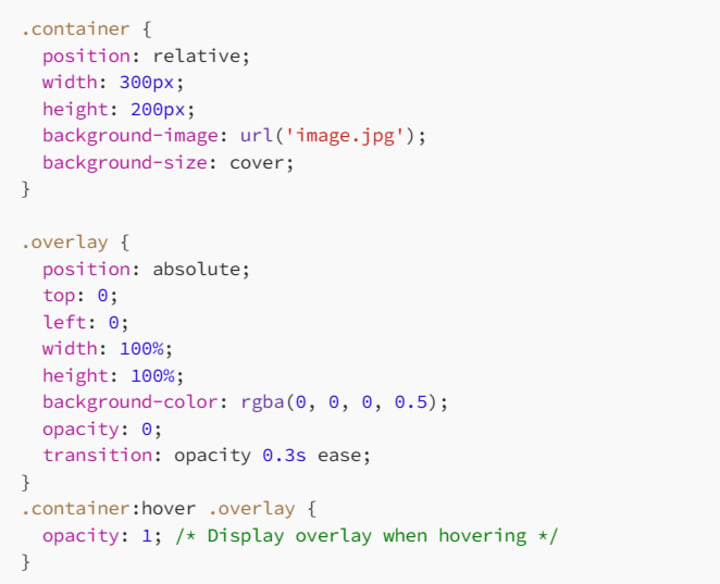 - position: absolute: Positions the overlay relative to its parent element (usually set to position: relative).