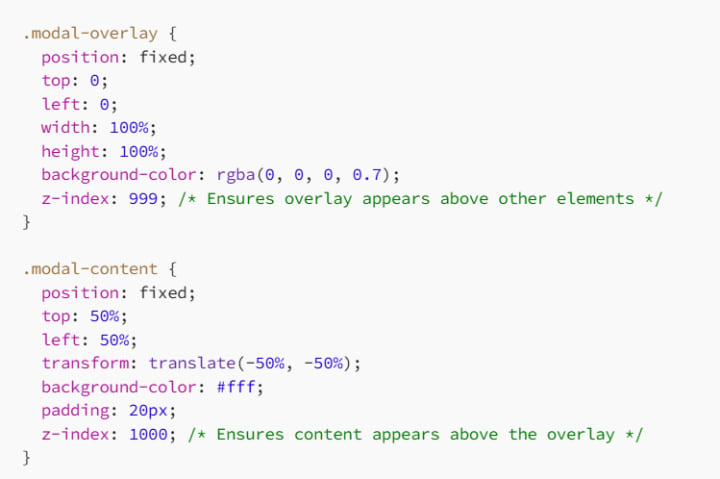 In this setup, the .modal-overlay will cover the entire screen with a semi-transparent black background, while the .modal-content is centered and stands out above the overlay.
