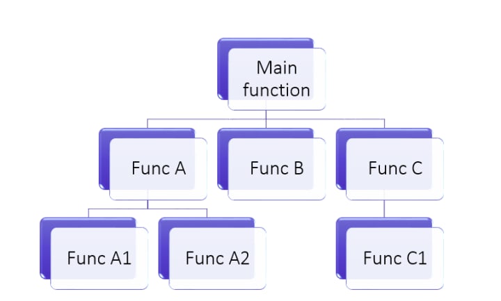The prominent fact is that the main() function contains numerous functions within it and calls the functions for execution. Hence, it is called the "calling function". The main() function follows the "Top-Down Approach", i.e., the main() functions has many functions such as FuncA, FuncB, FuncC and so on and these functions are divided into FuncA1,FuncA2 and so on. This is top-down approach.