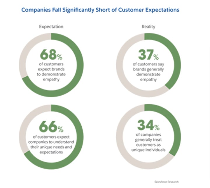 Today, 68% of customers expect brands to demonstrate empathy and 66% want them to understand their unique needs and expectations. But, as evident in the chart below, few brands are able to match these expectations.