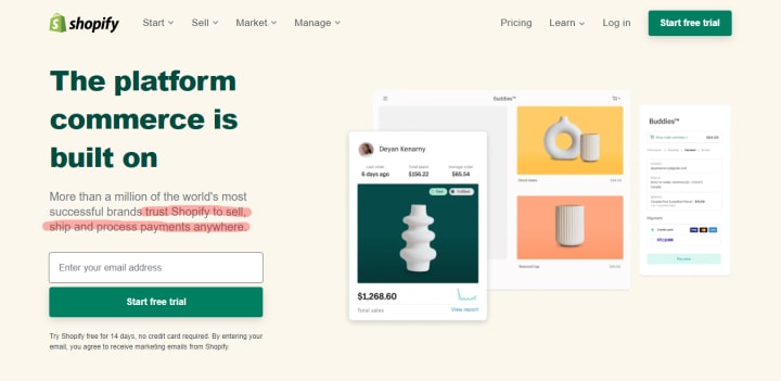 Similarly, Shopify offers a comprehensive and flexible ecommerce platform for all aspiring entrepreneurs and small business owners. The first thing you’ll notice on Shopify’s page is their value proposition - sell, ship, and process payments anywhere.