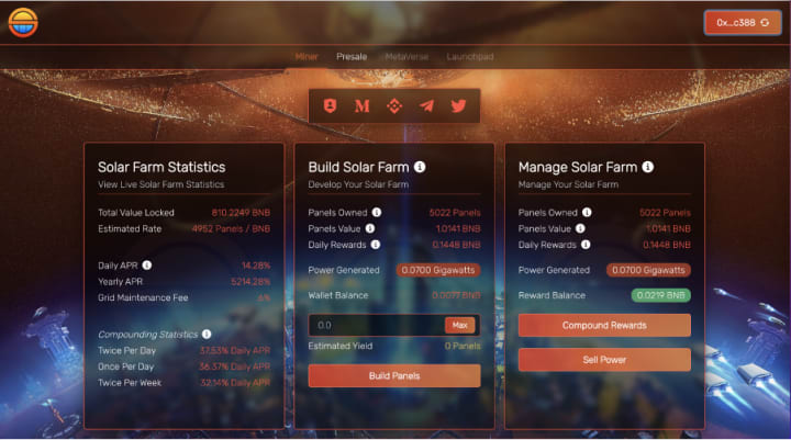 Your Panels will start to earn BNB as shown in the Reward Balance. You will then have to choose between “Compound Rewards” (selling current BNB rewards into more Panels) or “Sell Power” (to simply take out your reward in BNB).