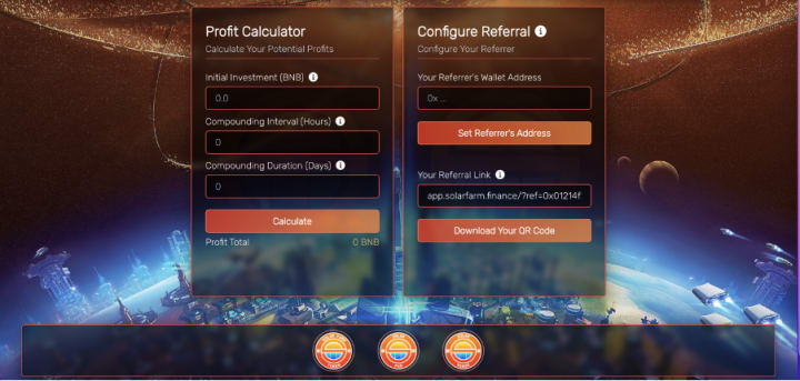 Connect; Visit the website: app.solarfarm.finance/?ref=0x01214f2487dDd5f1532D82C2E7497B395e69c388