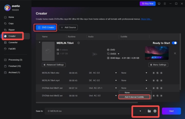 DVDFab DVD Creator is a versatile AVI to DVD converter to easily burn a wide range of videos into DVD format. Whether you have downloaded videos or self-captured footage, this tool allows you to transform them into professional-looking DVDs. One of the key features of DVDFab DVD Creator is its capability to add external subtitles to your videos, as well as the ability to remove unwanted audio tracks and subtitles according to your preferences. With this tool, converting AVI to DVD format, burning video DVDs to folders, ISO files, or directly to blank DVDs is simple and efficient.