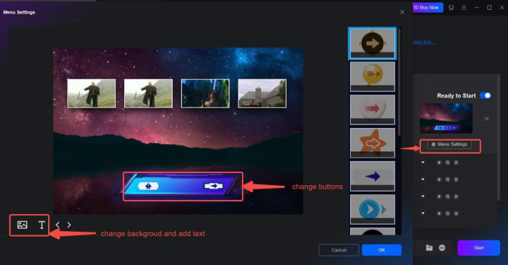 Step 5: Click the "Menu Settings" button and then change the background image, add texts, and change play buttons. Besides, you can also click "Video Edit" button to customize your video footage.