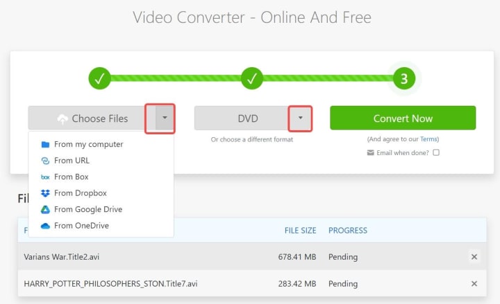 Zamzar provides an online file conversion service that allows users to upload their files from various locations, including local computers and online drives such as Google Drive and Dropbox. With just a few clicks, you go through all the ways from adding sources to choosing an output format from the list and starting the process. It's convenient for converting small files. However, it can work as an AVI to DVD authoring tool only. If you want to burn the created DVD to a blank disc, you will need to use an additional burning tool.