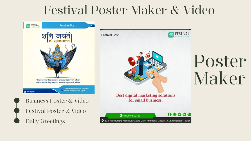 Festival Poster Maker App create A to Z Business frames so choose your business type and make your own frame with the details of your business-like name, email id, number and brand logo.