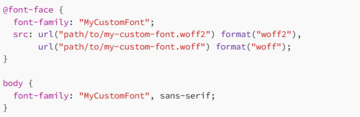 In this example, the @font-face rule tells the browser to load the custom font from your server. The src property specifies the file path for the font files in different formats (e.g., woff2, woff). The browser will use the font if it’s available, falling back to sans-serif if not.