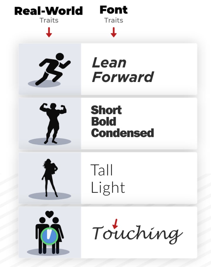 Fonts we use and read every day resemble objects from the world around us, which also influences perception. Each time we read a text on a website or mobile app, we will look for visual resemblances and traits. For example: