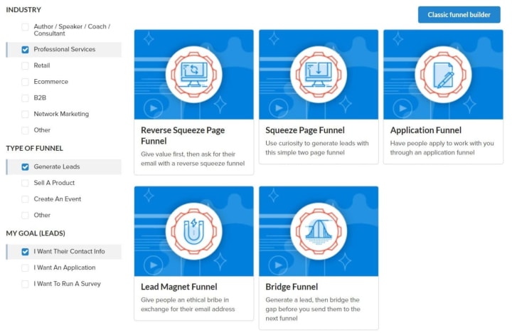 For example, if you choose the Funnel Cookbook, all you have to do is select your industry, the type of funnel you’re after, and your campaign’s goal, and ClickFunnels will select the funnel it thinks is the best for you to use.