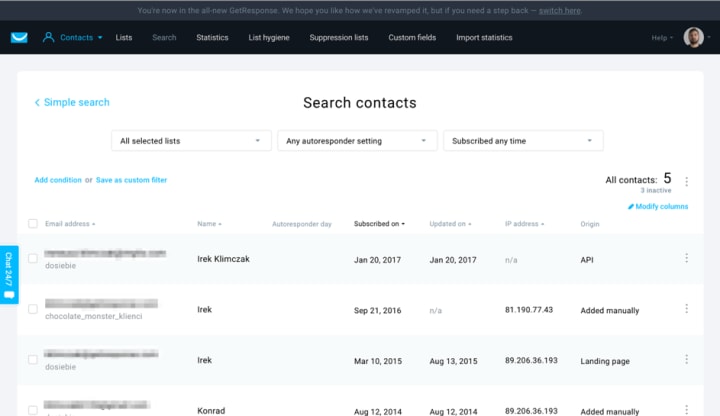 An example of searching for contacts in GetResponse