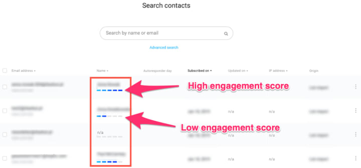 GetResponse also uses lead scoring to monitor those on your list who are most engaged with your marketing efforts. This lead score will be shown against every contact in your email list: