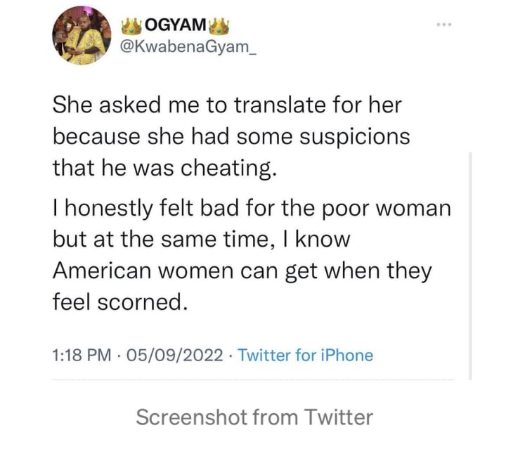 The Ghanian she asked refused to translate for her, while hundreds of Ghanians joined in on the Twitter thread, mocking and laughing at American women. Even calling them dangerous and saying it was better for the Ghanian man to scam her then to get physically hurt.