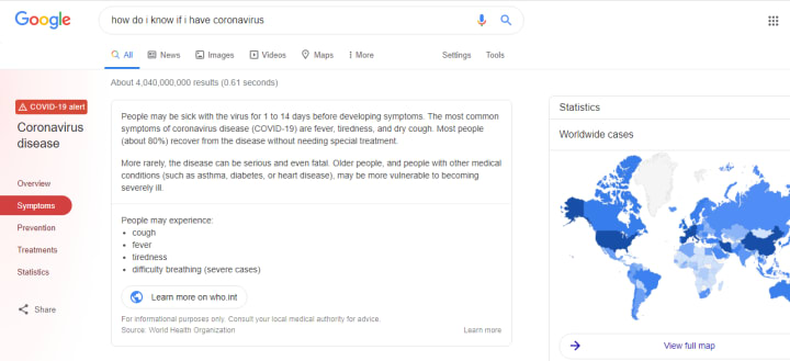 On Google, if you search the term: "how do i know if i have coronavirus", you will be shown a page like below which contains necessary information you'll need to know about the virus as well as how many confirmed cases, recoveries, and deaths there have been from the virus in your own country and around the world.