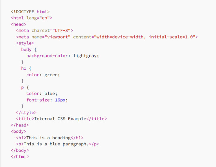 Internal CSS is defined within a <style> tag in the <head> section of your HTML document. This method is useful when you want to apply styles to a single HTML document without affecting others.