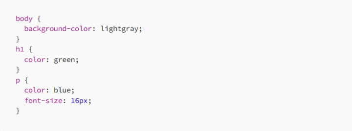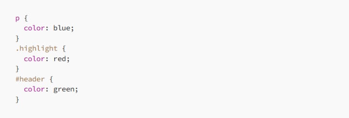 This rule selects all <p> elements (paragraphs) and styles them with blue text and a font size of 16 pixels.