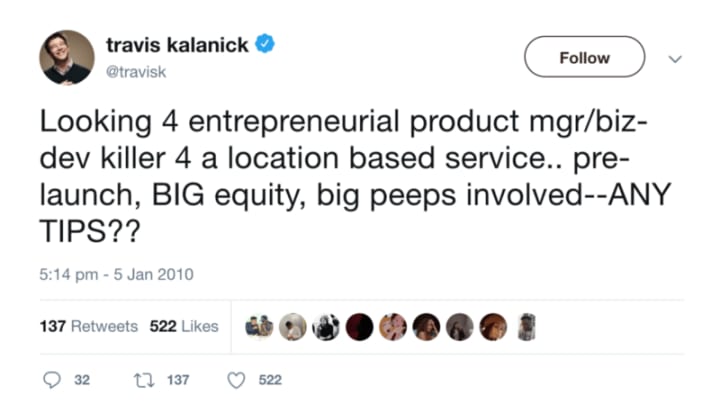 In 2010 Kalanick tweeted what is arguably one of the most valuable tweets in the history of Twitter.