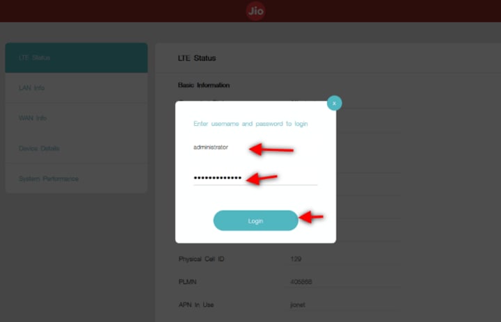 After finding the username & password, you have to go to http://jiofi.local.html and Log In